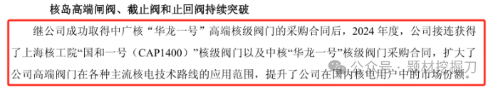 同时,纽威股份在 2024 年年报中说,公司获得了 “国和一号” 和 “华龙一号” 核级阀门采购合同,持续扩大在核电领域的份额。