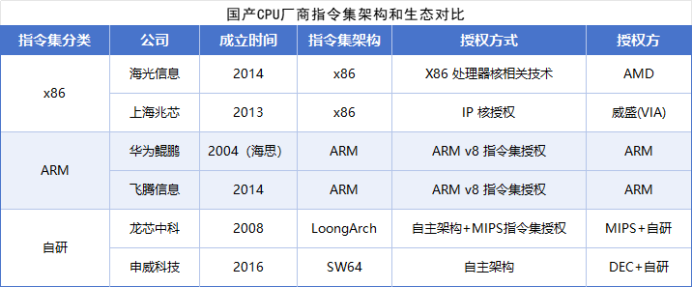 国内厂商中,华为海思与飞腾基于ARM架构,龙芯中科和申威科技是自研的指令系统,海光信息和上海兆芯则采用了x86架构。
