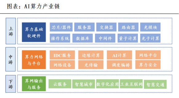 AI算力产业链,可以分为上游算力基础软硬件、中游算力网络与平台、下游算网输出与服务三个环节。