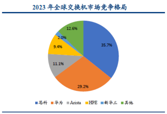 交换机行业市场集中度高,思科、华为等少数企业占据大部分份额。全球市场方面,思科稳居龙头地位,IDC数据显示,2023年思科全球市场份额达35.7%。思科、华为、Arista、新华三、HPE等头部厂商合计占据全球超过8成的份额。国内市场方面则是呈现双龙头格局,2023年华为、新华三分别以36.4%和35.2%的份额遥遥领先其他厂商,分别位居前两位,排名第三的锐捷仅占据12.4%的份额。近年来,国产设备商快速崛起,海外交换机厂商在中国的市场份额加速缩小。