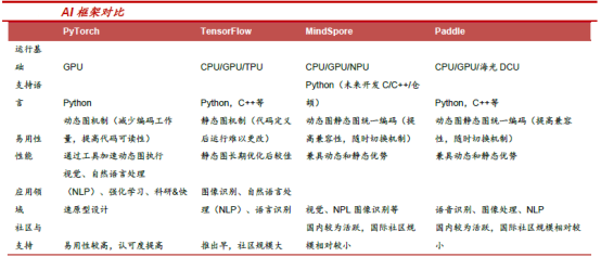 (2)软件:Google(TensorFlow)、Meta(PyTorch)、华为(MindSpore)、百度(PaddlePaddle)。