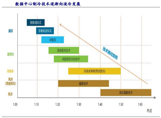 在散热系统方面,包括如风冷DX空调系统、水冷冷水机组系统、蒸发冷却系统、新型氟泵系统、液冷系统等。液冷技术能够满足AIDC高密度、低能耗的发展需求。随着数据中心规模不断扩大,行业耗电量与日俱增,当前数据中心平均PUE水平偏高,液冷方案可使PUE降至1.25以下。