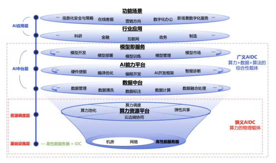 AIDC(Artificial Intelligence Data Center)即人工智能数据中心。狭义智算中心指是在传统数据中心的基础上,融合GPU、TPU、FPGA 等专用芯片以支撑大量数据处理和复杂模型训练,主要是把不同的计算任务实时智能调配给不同的服务器集群以提升计算效率。简单来说,狭义智算中心是“机房+网络+GPU服务器+算力调度平台”的融合基础设施,是传统数据中心的增值性延伸。广义智算中心是融合算力+数据+算法的新型基础设施,是AI件技术一体化的载体,是传统云的智能化升级