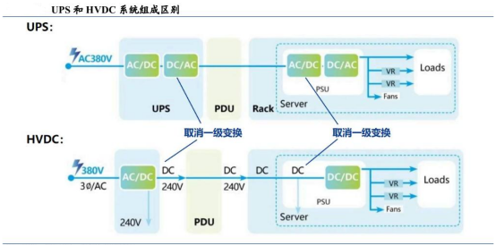 配电系统是AIDC基建的前置核心,约占总投资的9%。AC UPS是目前数据中心供电中最广泛应用的一种不间断供电系统,技术成熟、安全稳定。但随着数据中心规模的不断扩大和AI算力需求的提升和直流生态的普及,高压直流输电(HVDC)技术有望成为数据中心供电的新趋势。随着服务器功率提升,下一代HVDC可往400V/800V更高电压等级拓展,进一步提升供电效率。