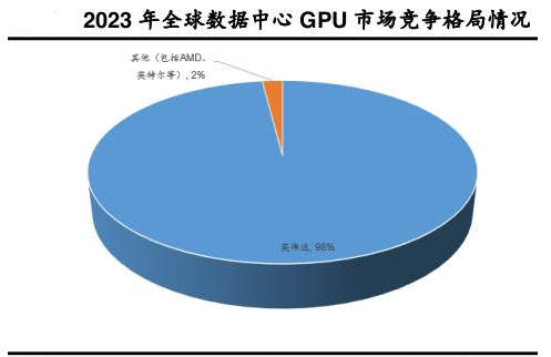 英伟达主导全球GPU市场。根据TechInsights的数据,2023年全球数据中心GPU总出货量达到了385万颗,其中英伟达数据中心2023年GPU出货量总计约376万颗,英伟达在数据中心GPU出货量中占据98%的市场份额