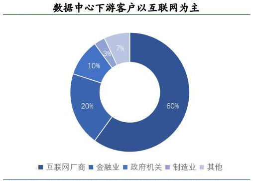 数据中心下游客户主要是互联网厂商,其次是金融行业、政府机构,分别占比60%/20%/10%。随着头部互联网厂商的大规模资本开支浪潮由海外向国内扩散,数据中心市场呈现出稳步增长的态势。