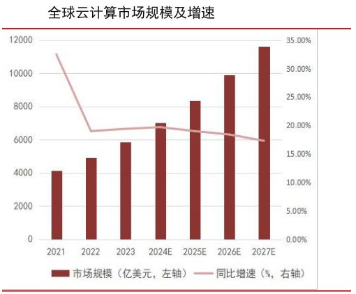 全球云计算市场稳步增长。据Gartner数据显示,2023年以IaaS、PaaS、SaaS为代表的全球云计算市场规模达到5864亿美元,同比增长19.4%,预计在2024年至2027年间,云计算市场将以18.6%的复合增长率增长,至2027年突破万亿美元规模。