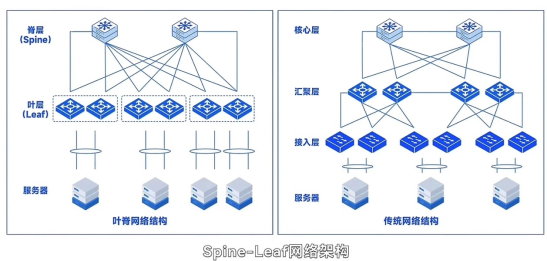 智算中心的网络设备技术要求很高,通常支持更高的网络带宽,范围在200-800GB,以应对AI大规模训练的海量数据传输要求。智算中心的网络拓扑主要采用Spine-Leaf架构,这种无阻塞网络拓扑结构能够确保数据流量的高效传输。Spine交换机连接所有的Leaf交换机,形成一个高带宽、低延迟的网络环境,非常适合AI训练和大规模数据处理。