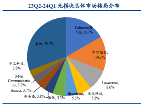 光模块是光纤通信系统中的核心器件,主要用于实现电信号与光信号之间的转换。目前,日本和美国光模块厂商正逐渐淡出全球市场,中国厂商在全球光模块市场中的占比逐步上升。2023年Q2至2024年Q1期间,中际旭创、光迅科技、新易盛在全球的市场份额分别为14.2%、5.8%、3.8%。