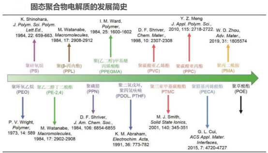 聚合物固态电解质是指具有能够传导锂离子的高分子材料。聚合物固态电解质中的重复单元含有特殊官能团,这种官能团能够与锂离子之间具有较强的相互作用,从而能够解离锂盐,通过高分子链段的运动传导锂离子。经过几十年的发展,多种聚合物材料均可作为聚合物固态电解质,如聚羧酸酯类、聚碳酸酯类、聚腈类、聚酰胺类、聚酰亚胺类、聚硫醚类等。