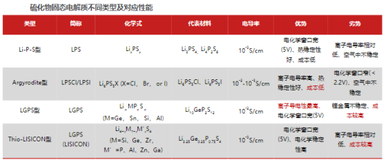 按照结晶形态,硫化物固态电解质可分为玻璃态、玻璃陶瓷态和晶态等3种类型,其中前两者离子电导率率相对较低,而晶态硫化物电解质离子电导率较高。在晶态的硫化物固态电解质中,LGPS型(如Li10GeP2S12)综合性能较高,但由于加入Ge元素,生产成本较高;LPSCl型(如Li6PS5Cl)具备成本优势,且工艺成熟度较高,为目前主流选择,但缺点是在空气中不稳定。
