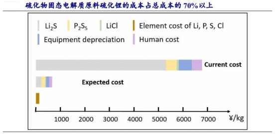 然而在大规模商业化生产前,仍面临诸多挑战,包括较差的电化学与化学稳定性、差的空气稳定性、电解质与正负极界面易发生副反应,以及高成本等。其中,在高成本方面,参照硫化锂每吨480万元的售价,折合成硫化物电解质的生产成本超过200万元/吨,折合成全固态电芯材料成本则约为2.2元/Wh。进一步换算,单GWh硫化锂价值量超过15亿元,在原材料成本中占比超7成,而目前普通三元电池中碳酸锂的价值量为5700万元/GWh。