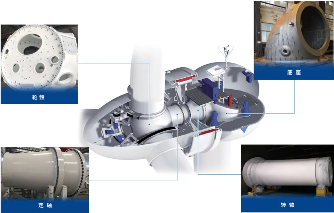 铸锻件被称为风机的“骨架”,一般采用高强度合金钢,部分关键部件也会使用不锈钢或钛合金。铸造时将金属熔融后倒入一个想要形状的模具中凝固成型,就能得到想要的形状和尺寸精度的成品或半成品。难点在于高精度的模具制造,还有合金成分配比,熔化温度和杂质、气孔的控制等,一个环节处理不好都会影响产品的质量。产品通常包括轮毂、主轴、齿轮箱壳体、机舱底座等大型铸件和锻件,轻的几吨,重的几十吨。