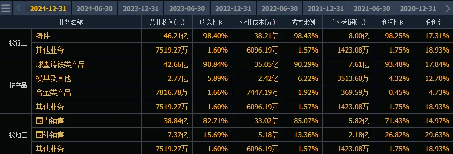公司2024 年铸件收入 46.2 亿元,毛利率 17.31%,同比下降1.17%。铸件产量 49.2 万吨,销量 49 万吨,订单状况总体平稳,产销基本平衡。