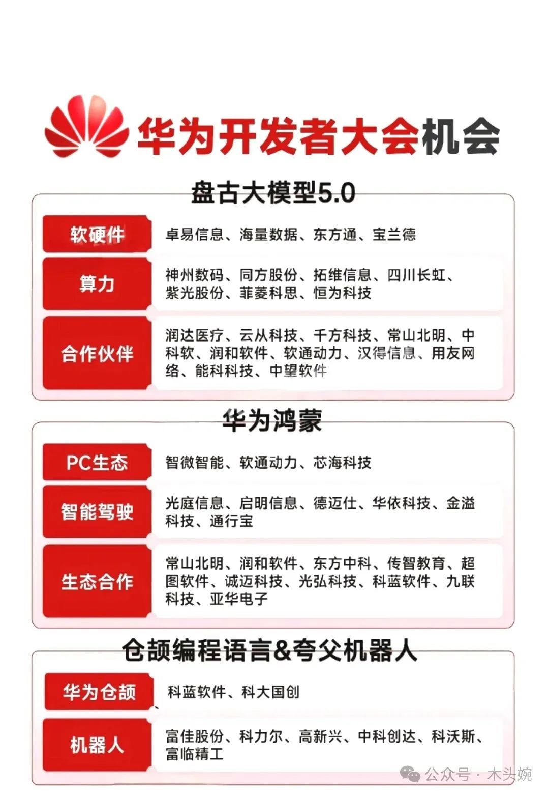 华为正式宣布开源盘古70亿参数的稠密模型、盘古Pro MoE 720亿参数的混合专家模型和基于昇腾的模型推理技术。利好盘古大模型概念和华为昇腾概念等等。