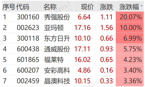 光伏方面,光伏屋顶概念股走高。秀强股份直线拉升,走出20cm涨停;亚玛顿涨停,东方日升、通威股份、福莱特等跟涨。
