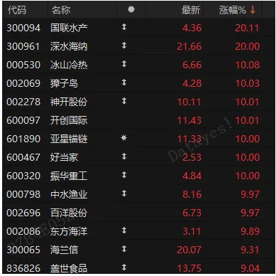 海洋经济概念早间大幅高开高走,板块指数盘中放量大涨逾7%,创历史新高,开盘不到1小时成交就超过昨日全天成交。60只概念股仅4只微跌,1只停牌外,其余全线飘红,克莱特触及30%涨停,深水海纳高开后秒速20%封板,坤博精工等近20股也强势涨停或涨超10%。