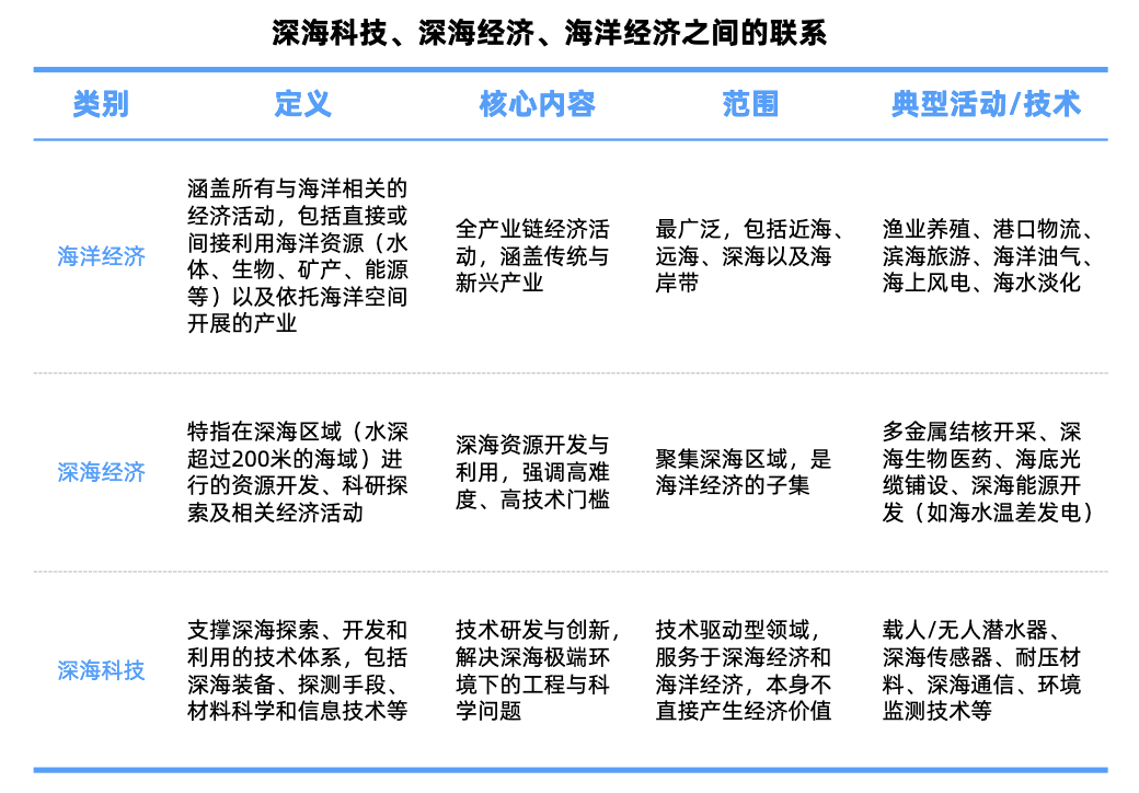 其中,深海经济以深海区域(水深超200米)为活动空间,其本质是通过科技创新突破深海环境限制,实现资源开发与产业升级的复合型经济形态。