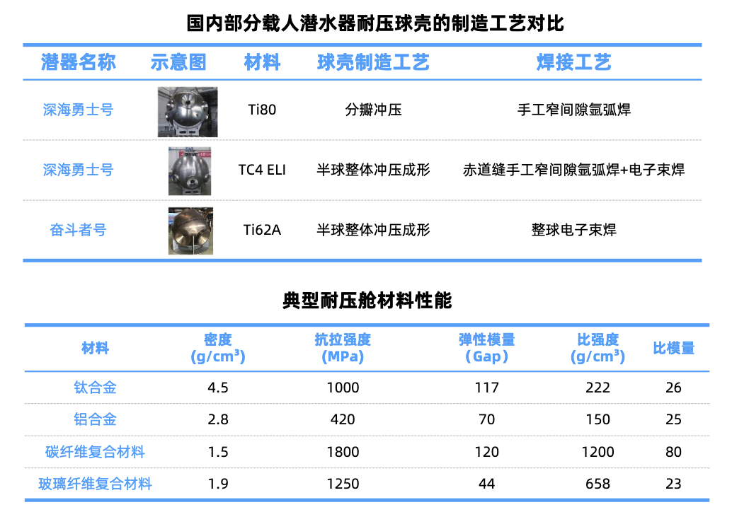 深海中主要材料分为两类:一种是制造耐压壳使用的结构材料,另一种是制造深潜器所用的浮力材料,包括高性能钢、合金材料和复合材料等。