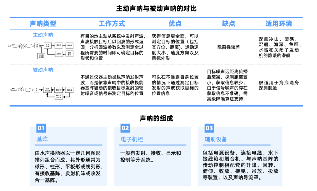 声呐系统:深海传感器的核心,为深海资源开发提供精准的定位服务。主动声呐可探测10公里外目标(如冰山、潜艇),但易被敌方声呐截获;被动声呐隐蔽性强(探测距离3-5公里),依赖目标自身噪声(如潜艇螺旋桨振动),适用于反潜侦察。主要厂商中,中科海讯具备声呐设备全系统设计生产能力、中海达在声呐系统及水下通信装备都有布局、中国重工主导研发“潜龙”系列AUV(自主水下航行器),搭载SLAM技术用于深海科考;中国海防是国内唯一涵盖水声电子全体系科研生产能力的企业;海兰信掌握海底观测网接驳盒、载人常压潜水系统等核心技术,同时涉足声呐系统领域。