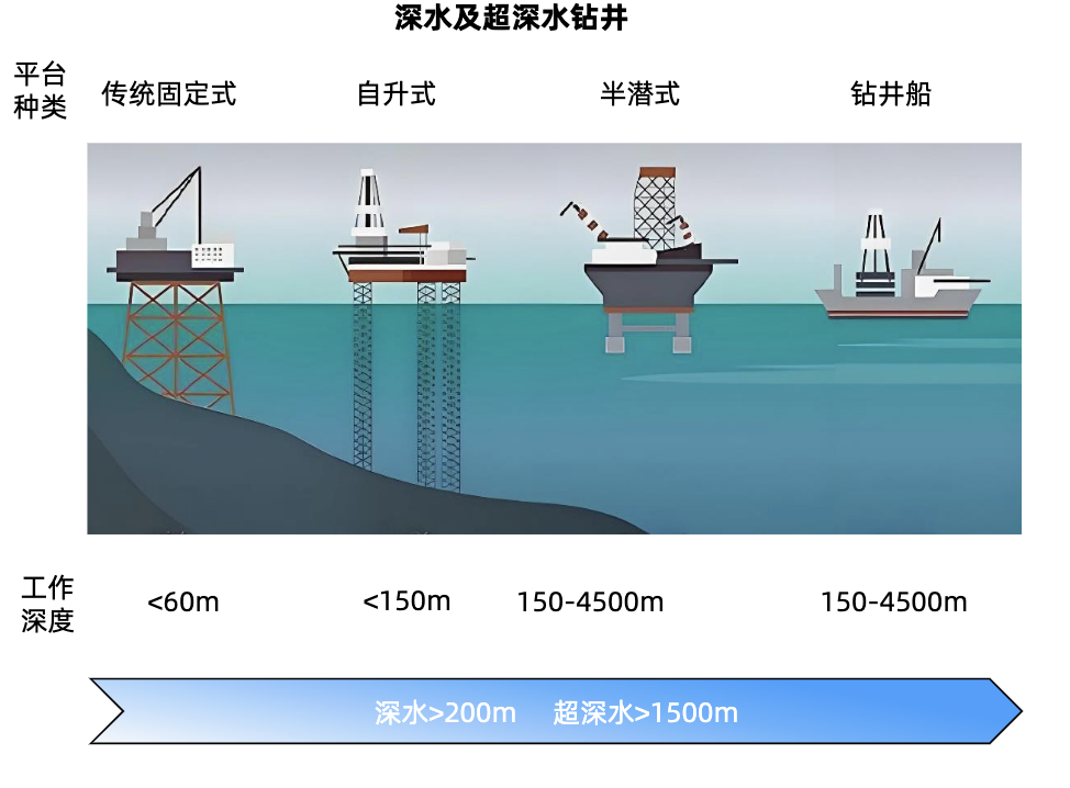 深海钻井平台:是集钻井、采油、储油等功能于一体的海上浮动或固定式结构,如“蓝鲸3号”钻井平台,配套全球首条3000米级超高强度缆索,抗拉强度达2000MPa,支撑深海油气勘探开发。中集集团主导建造“蓝鲸1号/2号”超深水双钻塔半潜式钻井平台;中海油服主导“蓝鲸”系列钻井平台技术覆盖超深水作业;中国重工参与“蛟龙号”深潜器及智能养殖工船建造;大连重工石油钻井平台专用起重机用于超万吨海上石油钻井平台;振华重工主要产品包括大型浮吊和油气平台部件。