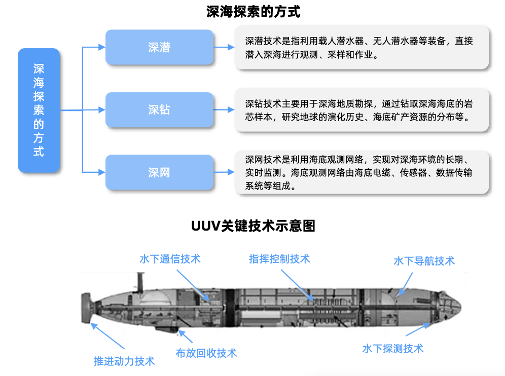 上游:包括原材料供应、关键零部件制造以及深海装备设计等环节。核心技术壁垒包含耐压材料(钛合金、碳纤维)、高精度传感器、深海通信系统和推进器等。
