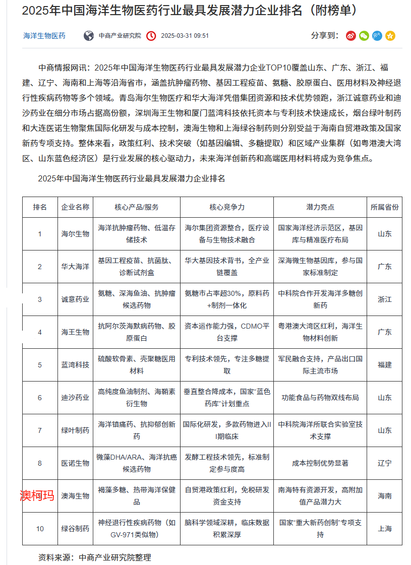 2025年中国海洋生物医药行业最具发展潜力企业TOP10覆盖山东、广东、浙江、福建、辽宁、海南和上海等沿海省市,涵盖抗肿瘤药物、基因工程疫苗、氨糖、胶原蛋白、医用材料及神经退行性疾病药物等多个领域。