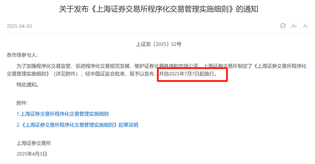 沪深北三个交易所搞了大半年的《程序化交易管理实施细则》,将在2025年7月7日正式上线!这是专门针对量化交易制定的措施,那些靠手速疯狂薅羊毛的套路,从野蛮生长到规范标准,被诟病已久的量化交易,终于要带上紧箍咒了!