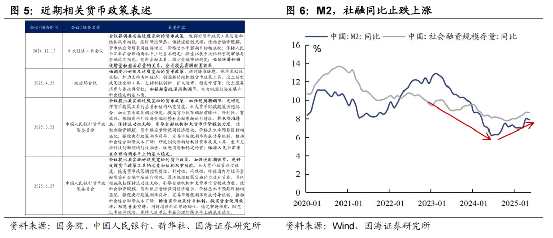 另一方面,政策转向正推动流动性传导机制优化,有望实现从“宽货币”到“宽信用”的转变。2025年4月政治局会议提出“加强超常规逆周期调节”,央行货币政策报告立场也明显转变,从2024年强调“盘活存量”,转向2025年一季度明确要求“引导金融机构加大货币信贷投放力度”。在此积极政策推动下,M2与社融增速已显现回升向好态势。后续,货币政策有望更有效地向实体经济传导,预计货币环境将持续保持宽松,市场风险偏好有望提升。