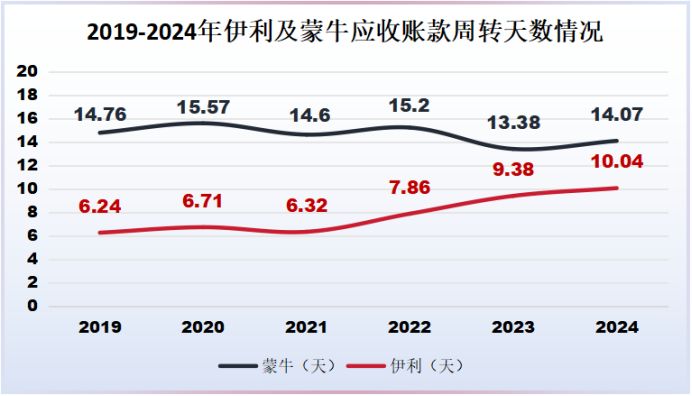 2019年至2024年,伊利因为放宽了信用政策,应收账款周转天数有小幅上升,但绝大多数都保持在10天以下,而且一直比蒙牛低。