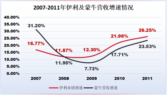 2008年蒙牛的营收增速大幅下降至11.95%,后续2009年至2011年,公司营收增速虽然有所回升,但始终低于伊利股份,奠定了蒙牛营收被伊利反超的基调。