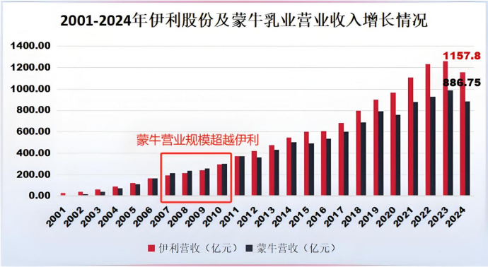 后来通过上游奶源争夺战和“中国航天员专用奶”的称号,蒙牛乳业的营收规模在2007年至2010年期间超越了伊利。