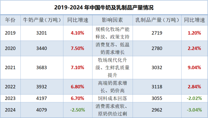 2019年至2023年,在我国牛奶产量平均增速达到了6.44%的情况下,中游乳制品(牛奶加工产品)的产量增速却从2022年开始放缓,到2023年更是下滑了2.02%。