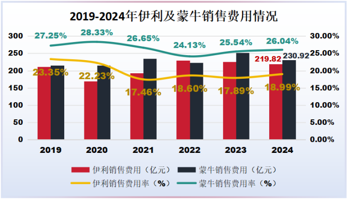 2024年,伊利的销售费用为219.82亿元,销售费用率为18.99%;而同期蒙牛的销售费用为230.92亿元,销售费用率更是高达26.04%,均高于伊利。