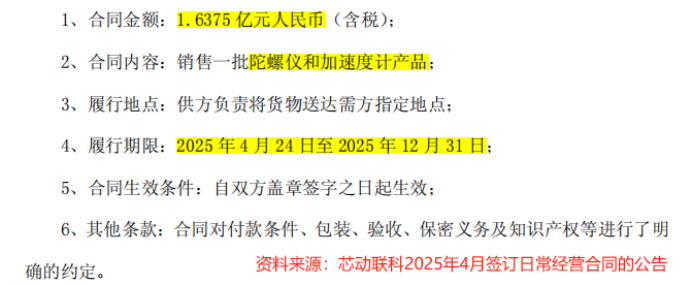 2025年以来,芯动联科共披露了2份订单。一份是1月签订的2.7亿元的陀螺仪销售合同,另一份是4月签订的1.6亿元的陀螺仪及加速度计销售合同,总计4.3亿元,最后履约期限都是2025年底。