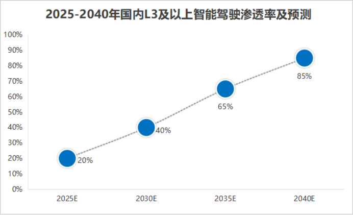 目前,智能驾驶正处于快速渗透期。预计2025到2040年,国内L3及以上智能驾驶渗透率将从20%飙升到85%。