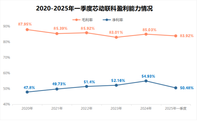 2020到2025年一季度,芯动联科毛利率持续保持在80%以上,在高壁垒、高溢价的盈利模式上有些茅台的影子。公司净利率更是惊人,常年高于40%,2024年达54.93%,一举超越了茅台(52.27%)。