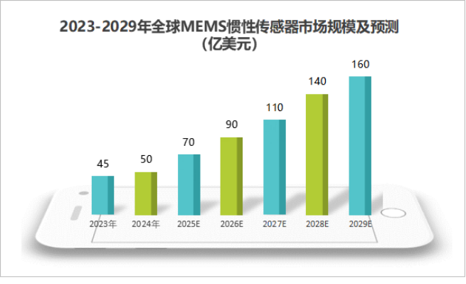数据显示,2023年全球MEMS惯性传感器市场规模仅为45亿美元,预计2029年将迅猛增长到160亿美元,年复合增长率超20%。