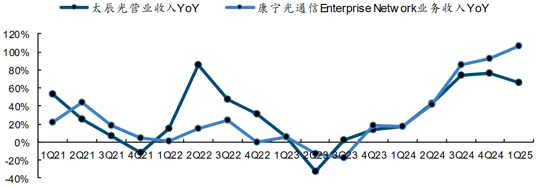 太辰光是国内光纤连接器领军,康宁占公司收入比重的70%。康宁的下游客户包括英伟达、微软等,公司通过康宁间接供应北美客户,太辰光收入约占康宁光通信业务营业成本的12%。根据康宁1Q25业绩会,25Q1光通信企业网络产品2024-27年收入CAGR的指引为18%,对比4Q24的指引提升6pct,体现下游需求旺盛。