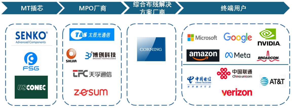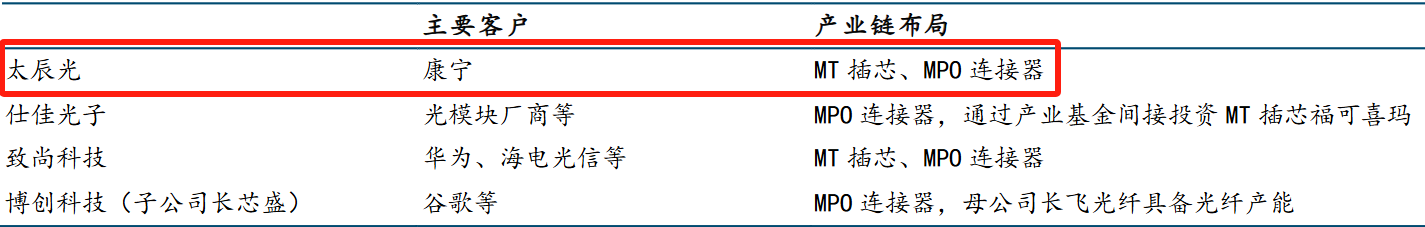 MPO产业链上游原材料主要为MT插芯等,供应商包括US Conec、福可喜玛、扇港等。太辰光是MPO连接器供应商,通过康宁间接供应终端客户,康宁的下游客户包括英伟达、Lumen、博通、微软等。