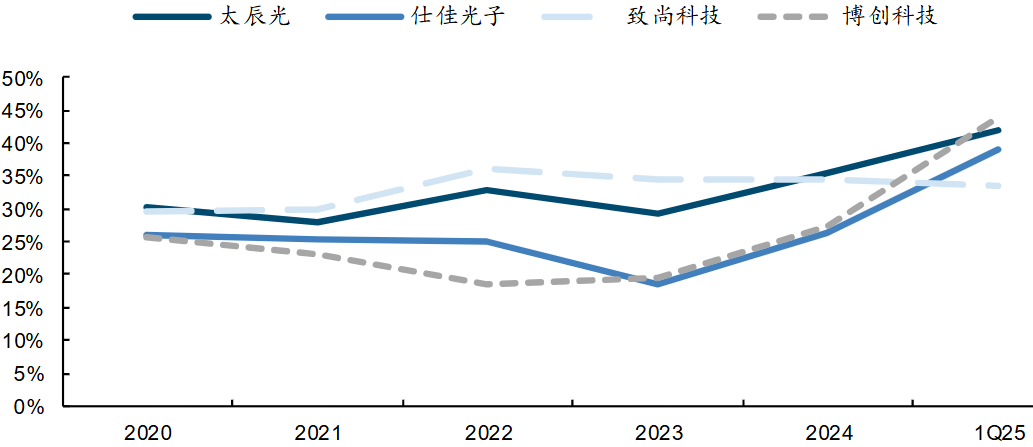 2024年起,受益于MPO行业进入上行周期,太辰光、仕佳光子、致尚科技、博创科技等MPO产业链内公司迎来业绩放量,同比增幅达到高双位数、乃至三位数。从盈利能力看,由于太辰光通过康宁供货北美云厂商,同时自供MT插芯,公司的盈利能力处于行业内相对领先的水平。2024年太辰光毛利率为36%,2025年提升6pct至42%。