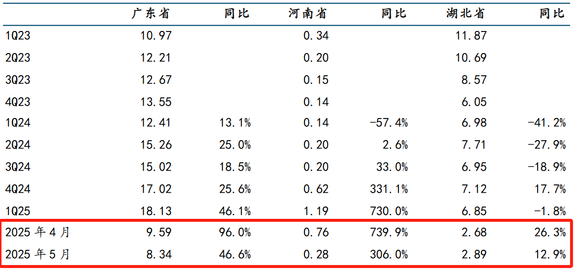 从最新海关数据看,1Q25/2025年4月/2025年5月广东省的光缆出口金额分别同比增长46%/96%/47%,景气度维持在较高水平;1Q25/2025年4月/2025年5月河南省的光缆出口金额则同比+730%/+740%/+306%;湖北省1Q25/2025年4月/2025年5月的光缆出口金额同比-1.8%/+26%/+13%。
