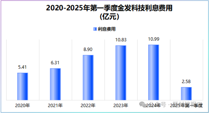 利息费用太高:近几年金发科技借了不少钱,2025 年一季度有息负债接近 300 亿元,是 2020 年的 3 倍。利息费用也从 2020 年的 5.41 亿元涨到 2024 年的 10.99 亿元,压缩了净利润空间。
