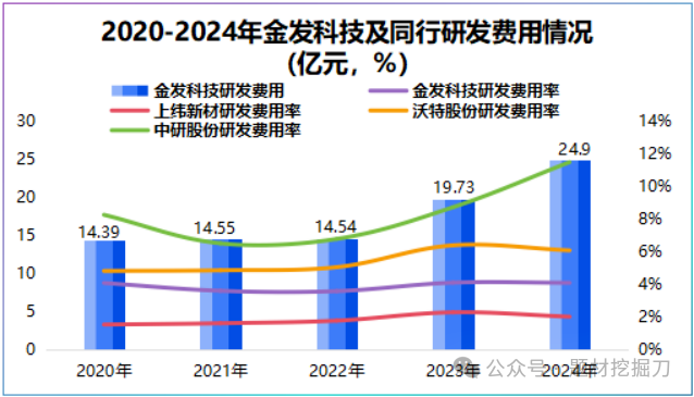 2020-2024 年,金发科技平均研发费用率约 4%,虽然比沃特股份、中研股份略低,但架不住投入多 —— 五年累计研发费用达 88.11 亿元。