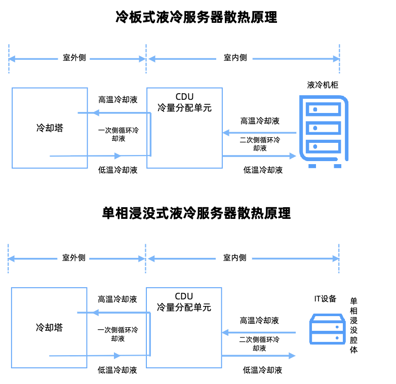 根据冷却液在循环过程中是否发生相变,分为单相浸没式液冷和两相浸没式液冷。两种液冷方式均依赖于室外冷源和CDU(冷却分配单元)来实现散热效果,但是在设备要求上存在显著差异。