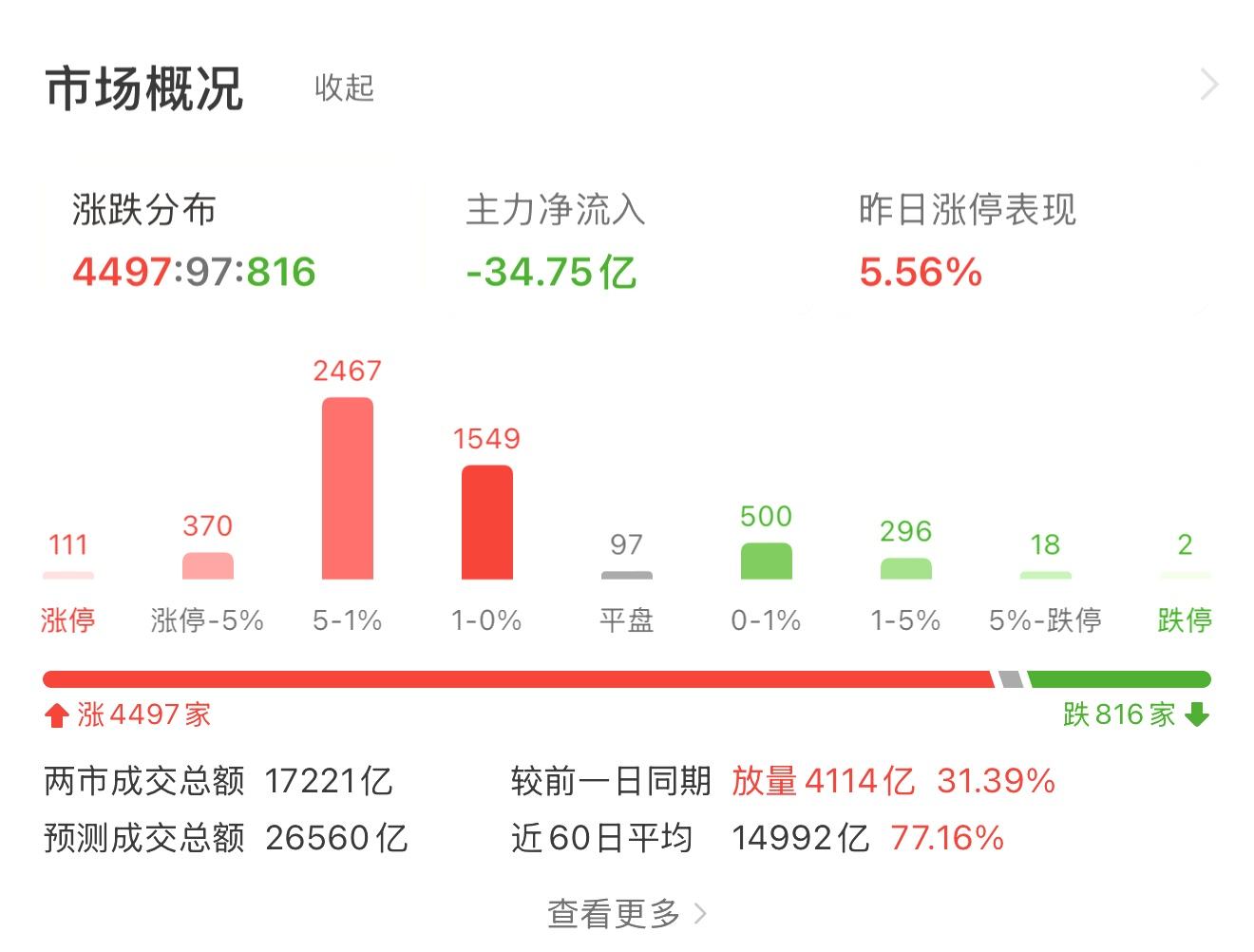两市成交量17221亿,相比周五大幅放量31.39%,牛市来了,很多踏空资金开始进场了,会继续推动A股上涨。