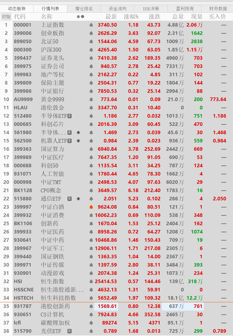 周一两市高开高走,截止午间收盘,盘面上半导体芯片、人工智能机器人、CPO通信、计算机软件、创业板、证券、军工、传媒动漫游戏、港股恒生科技、计算机、光伏等全部暴涨,两市涨多跌少,赚钱效应非常好,歪瑞古德。