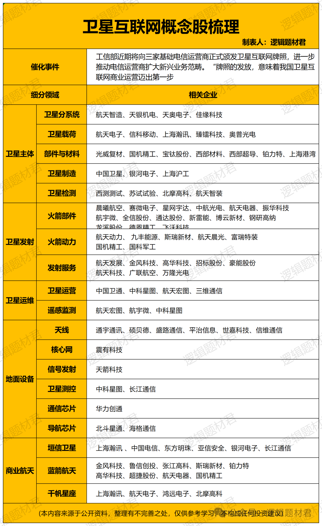 题材君接下来帮大家梳理一下卫星互联网相关概念股,并筛选其中最核心8家企业,以便大家供大家研究参考,以便后期跟踪