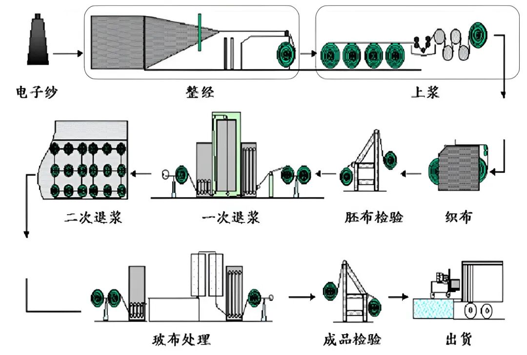 (3)织造使用喷气式织布机将经纱和纬纱交错编织,形成电子布基材。织造时需控制纱线张力和织机参数,避免纱线摩擦导致起毛、破丝等缺陷,确保布面平整度和经纬密度均匀。
