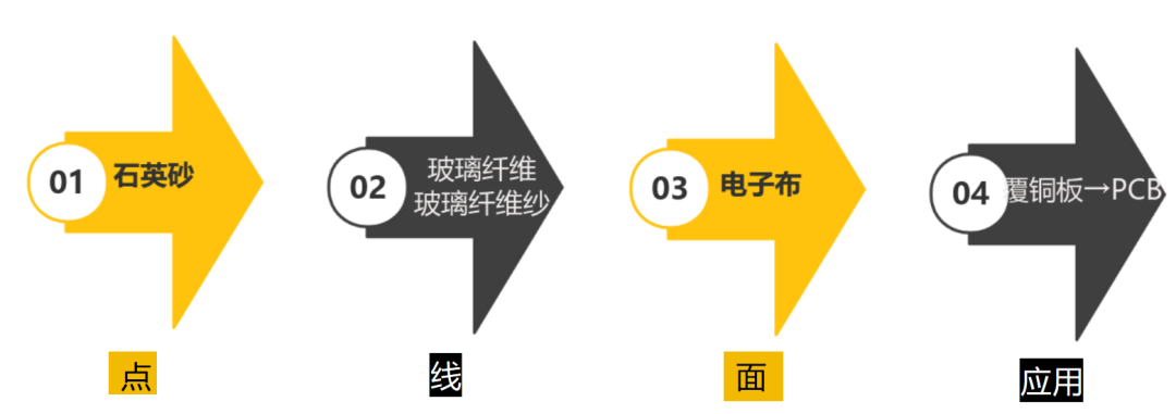 电子布的本质是“玻璃纤维”,而“玻璃纤维”则主要以“石英砂”为原料生产而成。石英砂”是颗粒状的原料,“玻璃纤维”是丝状的纤维,“玻璃纤维纱”则是由丝捻成线,最终通过机器织成“电子布”。产业链关系如下: